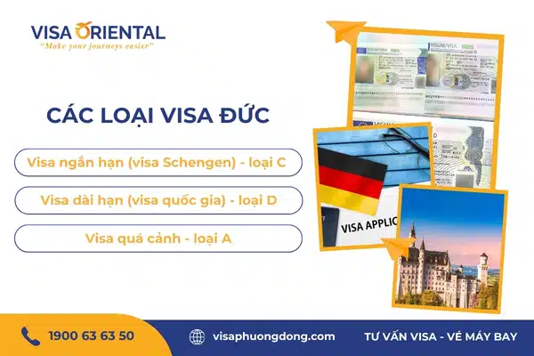 Đức có 3 loại visa phổ biến gồm visa ngắn hạn (hay còn gọi là visa Schengen/visa loại C), visa dài hạn (hay còn gọi là visa quốc gia/visa loại D) và visa quá cảnh (visa loại A).